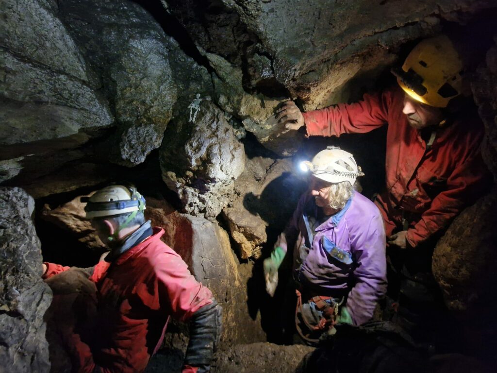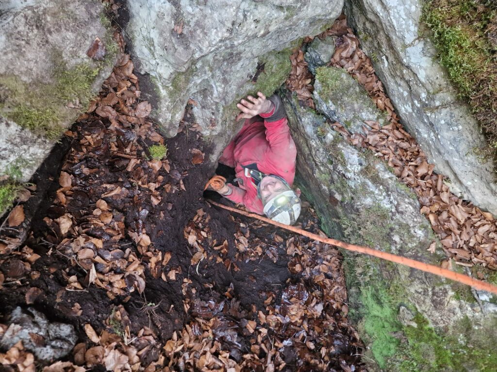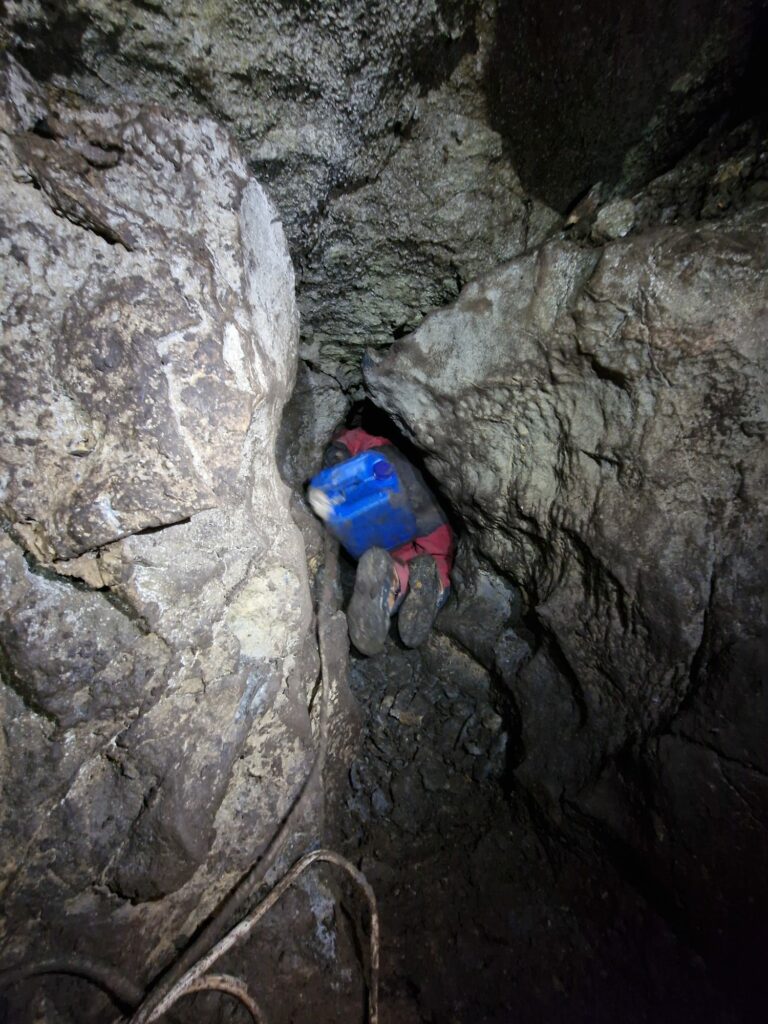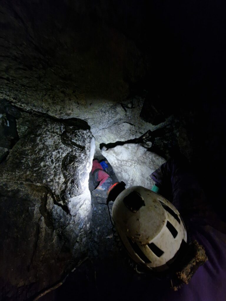 Retour au chantier, ou l’agrandissement progresse, le courant d’air est assez net, et le boyau continue. Encore du travail en perspective. Nous sommes à -10 à epu près, et l’ensemble des passages de la cavité ne nécessitent qu’une poignée et une paire de longes. On peut même s’en passer, mais c’est un peu risqué dans le ressaut d’entrée .