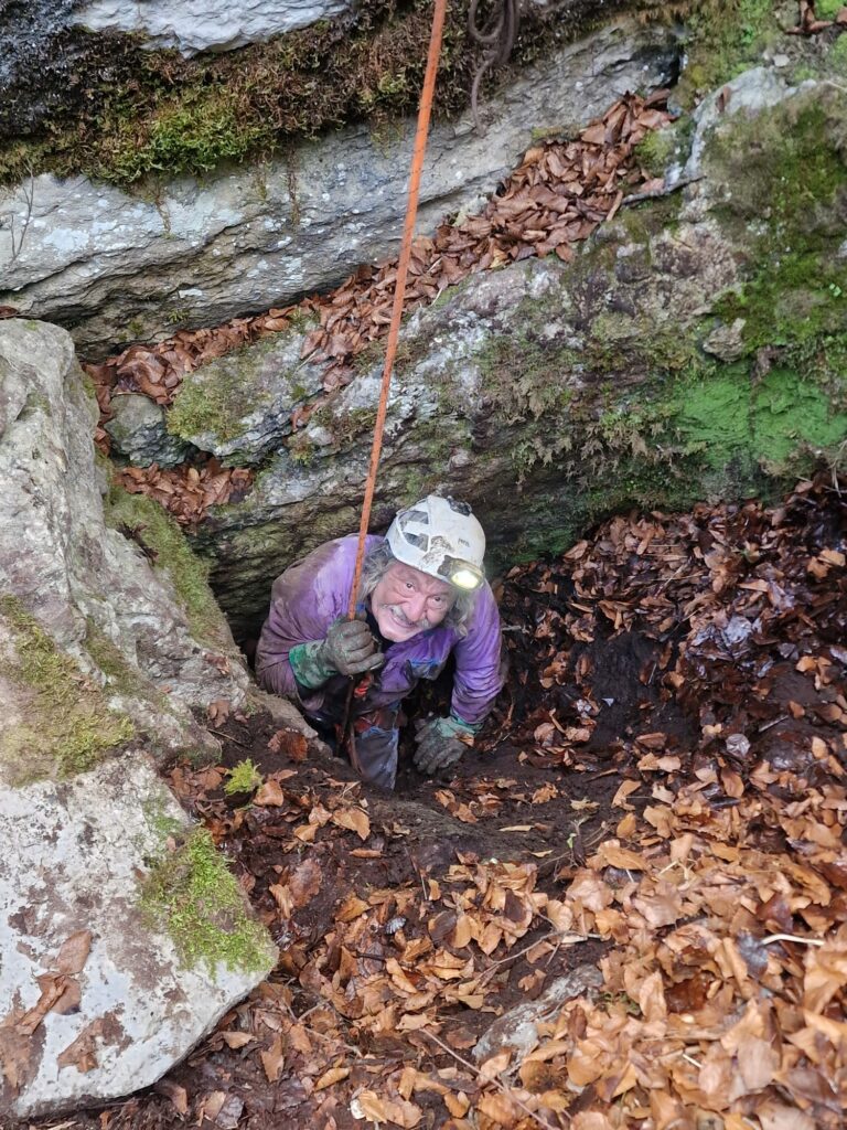 La troupe atteint enfin la cavité, et s’équipe. David double encore à mon grand étonnement les ancrages de l’entrée, passant à 4 ; et encore deux pour le frac, ce qui me paraît un peu excessif pour un ressaut de quatre mètres, mais bon . Une première équipe descend au fond et commence l’agrandissement . Puis on agrandit le deuxième ressaut, – Serge pourra passer sans jurer car après cet agrandissement, Jean Louis passe sans problème.
