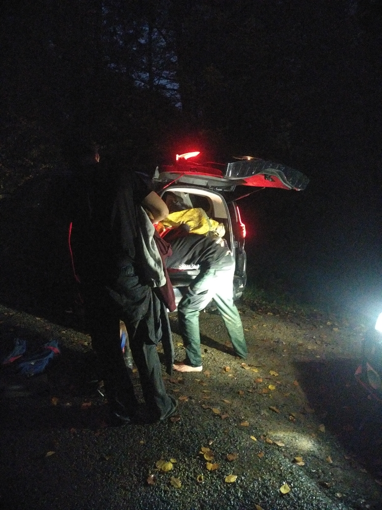 Sortie du trou en étroiture verticale rendue un peu plus difficile avec le kit du perfo entre les jambes et petit option météo en plus du poncho. Bière du soir à 3 (Émilie, Benãt et Franck)