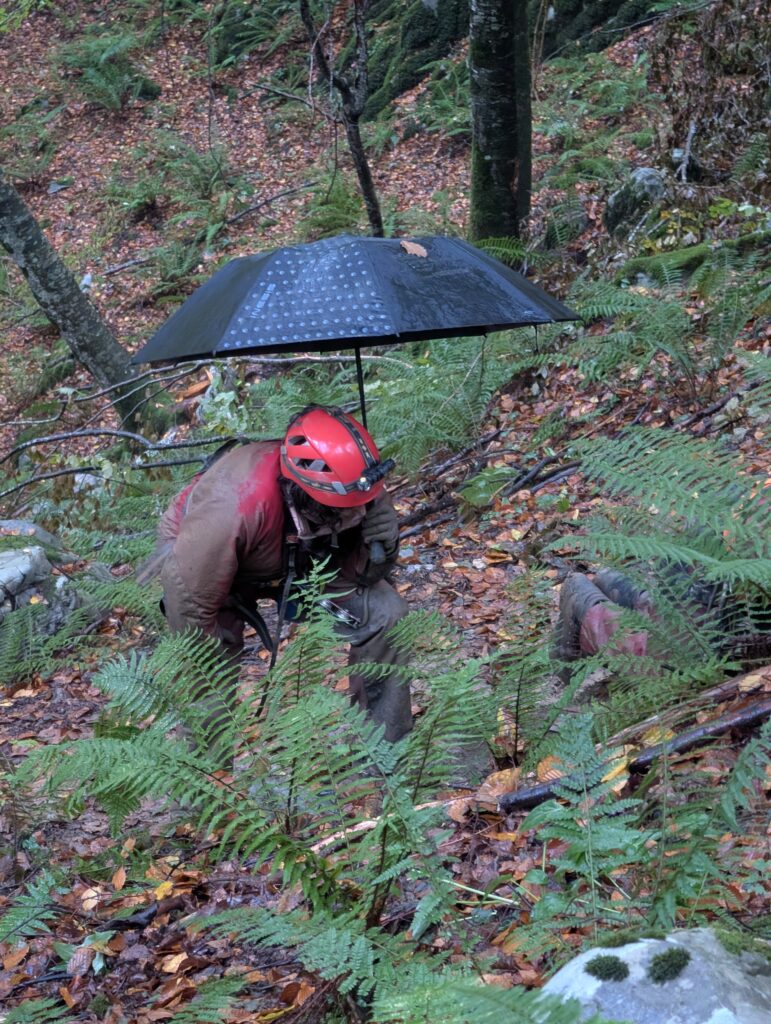 Lors de la marche d’approche, une première avec le puits repéré par Franck en début d’année , une ouverture d’un mètre de diamètre au pied d’un arbre sans repère minéral, un vrai piège de 4- 5 mètre de fond : résultat de la descente de Seb en 3 mn un crâne de sanglier mais sans espoir de continuité. Envisager la sécurisation de ce piège.